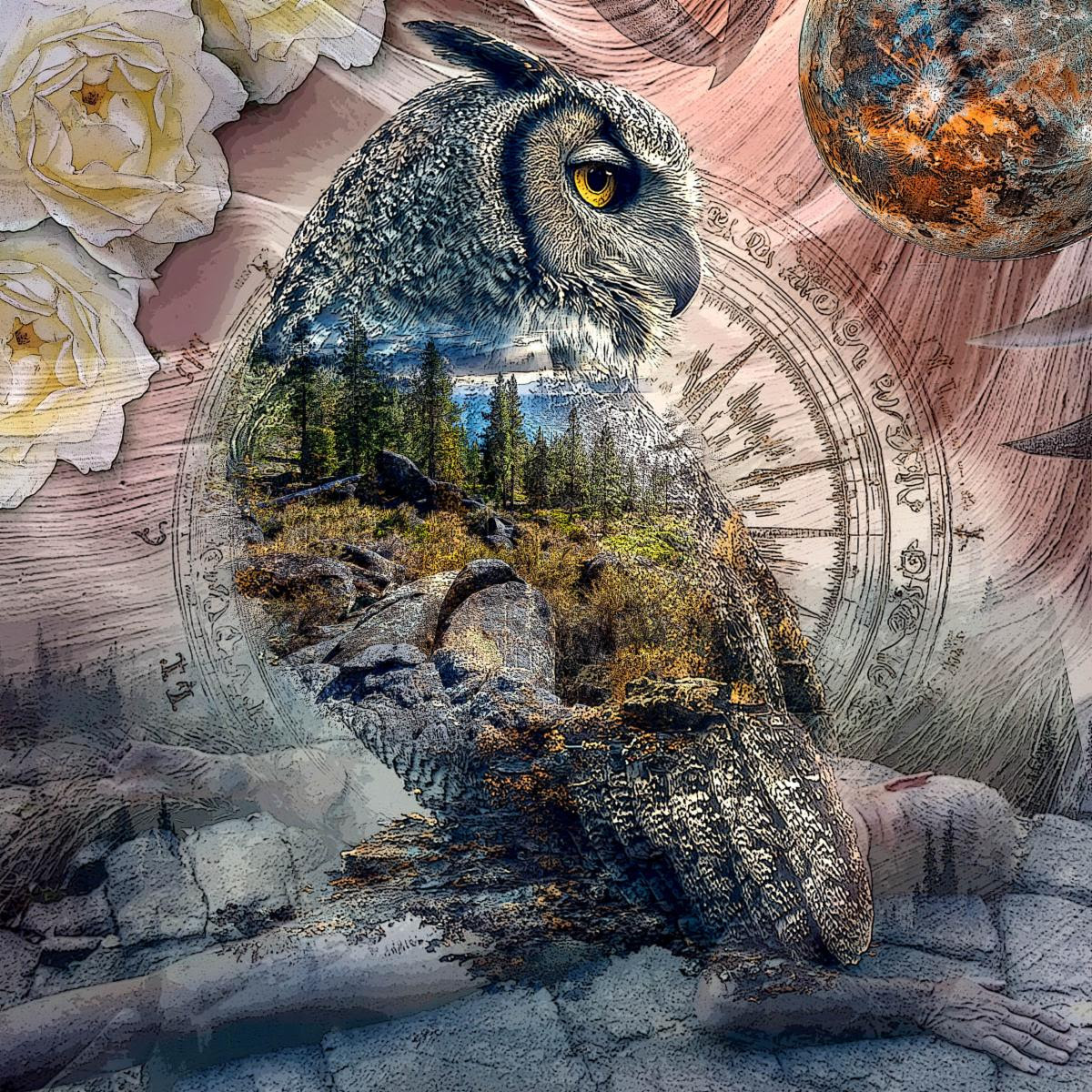 Owl moves closer as you walk,
